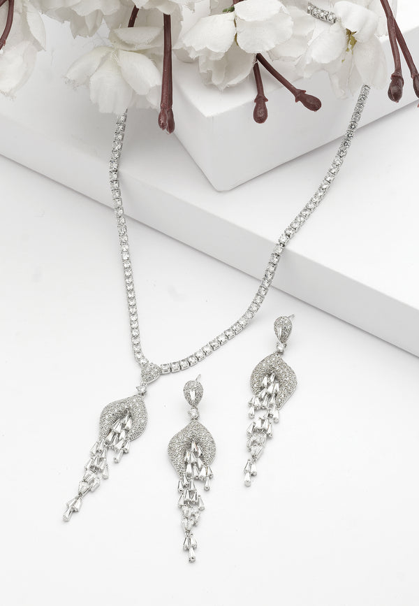 Diva Elegant Chandelier Halskæde og Øreringe Sæt fra Diva-kollektionen er et betagende ensemble, der udstråler overdådighed og sofistikering. Dette sæt har en tennis kæde halskæde prydet med en fantastisk chandelier...