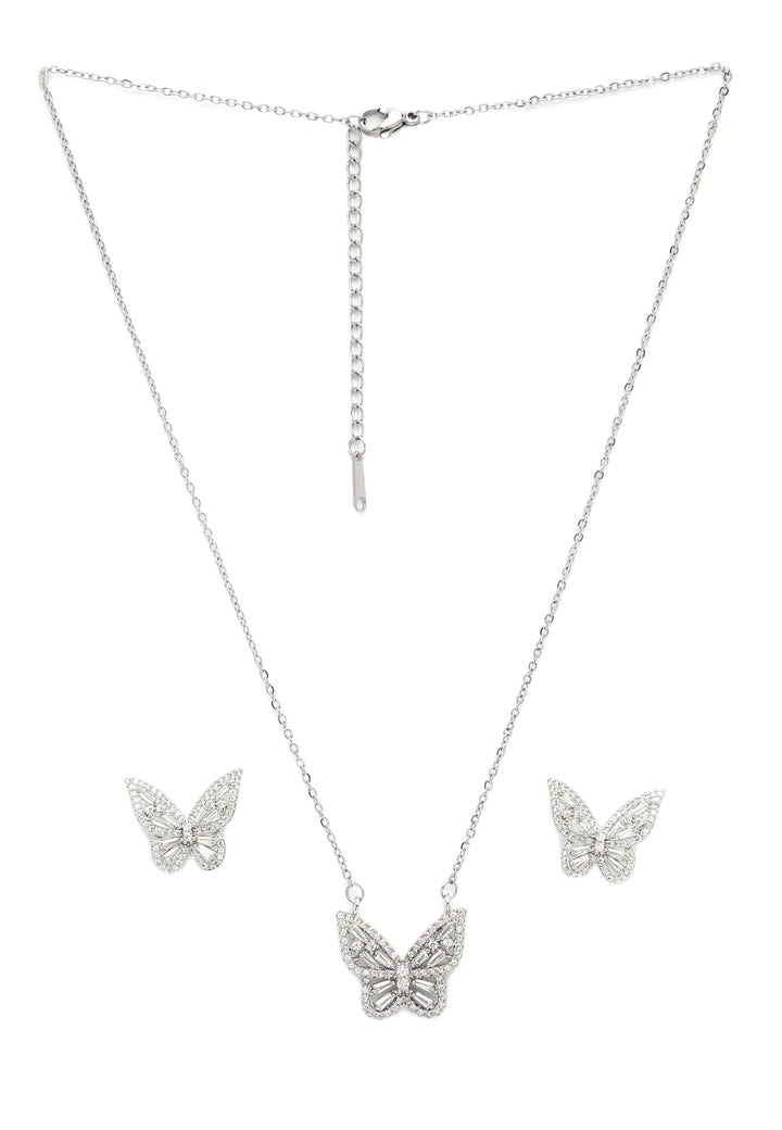 Delight in the whimsical charm of this butterfly-inspired jewelry set, designed to bring a touch of elegance and joy to your style. The necklace features a beautifully crafted butterfly pendant, its delicate wings adorned with shimmering stones that catch the light with every movement. The matching earrings mirror the enchanting butterfly motif, adding a playful yet sophisticated touch. Perfect for any occasion, this set effortlessly enhances your outfit, whether you're attending a formal event or adding a little sparkle to your everyday look. Lightweight and radiant, it's a lovely way to celebrate your love for nature and timeless beauty.