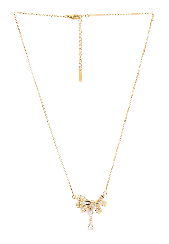 Grace your neckline with this exquisite golden bow necklace, a perfect blend of charm and sophistication. The intricately designed bow sparkles with shimmering stones, while a delicate dangling teardrop pendant adds a touch of elegance and movement. Ideal for both special occasions and everyday wear, this necklace brings a playful yet refined touch to any outfit. Whether paired with a chic evening gown or a casual ensemble, this piece is sure to make you feel effortlessly graceful and stylish.