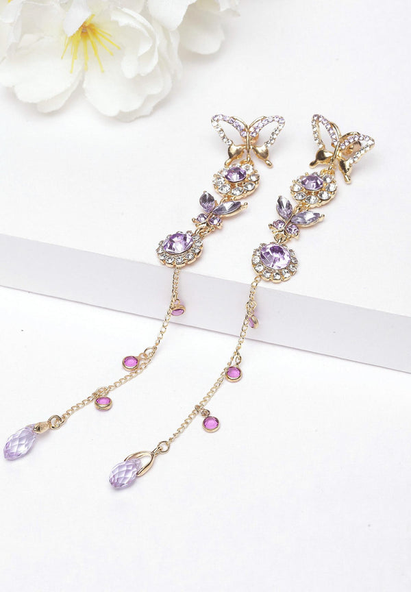 Orecchini pendenti lunghi in cristallo viola con farfalla
