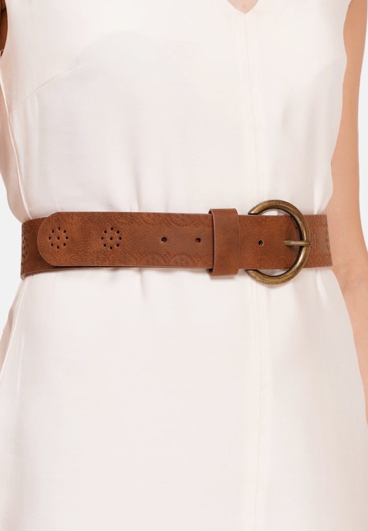 La cintura con fibbia rotonda del designer contemporaneo in colore marrone è un accessorio elegante e moderno che reinterpreta un classico, combinando pelle liscia con una fibbia rotonda distintiva che emana un senso di lusso e design di alta gamma. La fibbia rotonda, spesso caratterizzata da dettagli minimalisti o raffinati, crea un punto focale forte che aggiunge sia sofisticazione sia un tocco contemporaneo a qualsiasi look. Questa cintura fonde perfettamente lo stile tradizionale con l'estetica moderna, rendendola un accessorio versatile per una vasta gamma di occasioni. La fibbia rotonda conferisce al look un tocco raffinato e da designer che eleva il tuo abbigliamento da lavoro.