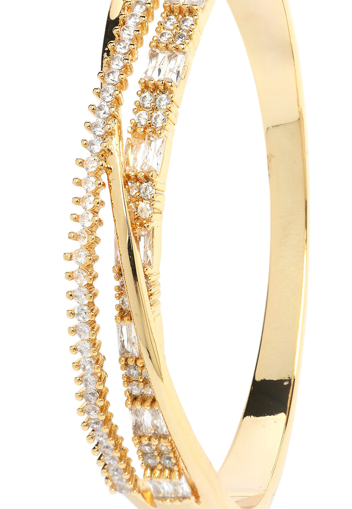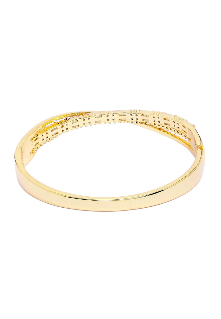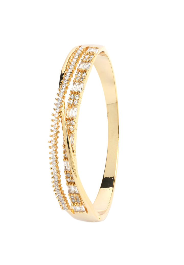 Deze prachtige armband straalt elegantie uit met zijn ingewikkelde, gedraaide ontwerp dat goud en glinsterende diamanten met elkaar verweeft. Rijen van stralende stenen schitteren briljant en creëren een betoverend spel van licht en luxe. Perfect in balans tussen tijdloze schoonheid en hedendaagse flair, is dit stuk een gracieuze aanvulling op elke sieradencollectie, ideaal voor speciale gelegenheden of om de dagelijkse stijl te verfraaien.