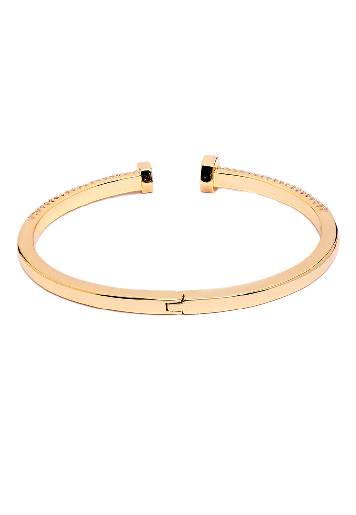 Het slanke, open ontwerp is versierd met een verbluffende reeks sprankelende stenen, wat een luxueuze en opvallende uitstraling creëert. De warme, gouden tint voegt een vleugje verfijning toe, waardoor het de perfecte accessoire is voor elke gelegenheid.