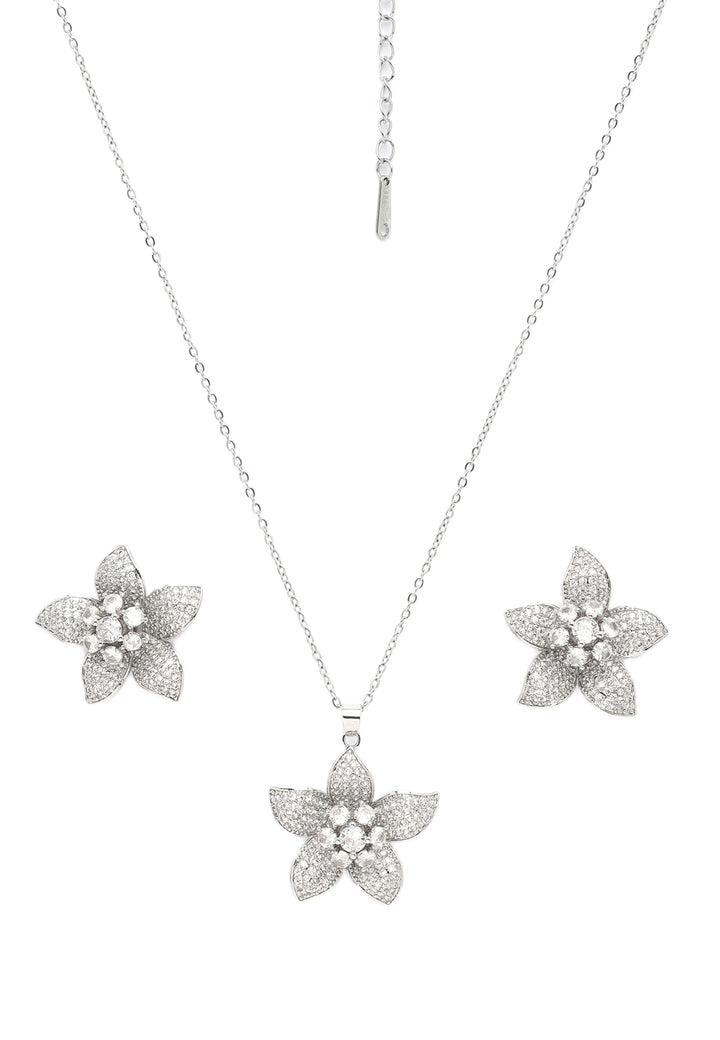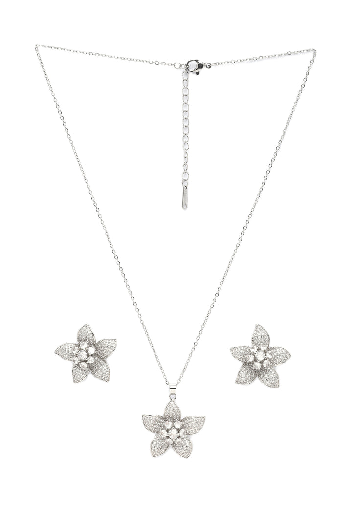 De ketting heeft een stralende bloemenhanger versierd met glinsterende stenen, perfect aangevuld met bijpassende oorbellen die de elegantie weerspiegelen. Ontworpen om het licht bij elke beweging te vangen, is deze set een symbool van verfijning en gratie. Ideaal voor speciale gelegenheden of om een vleugje sprankeling toe te voegen aan je dagelijkse ensemble, het is een tijdloze aanvulling op je collectie die nooit onopgemerkt zal blijven.