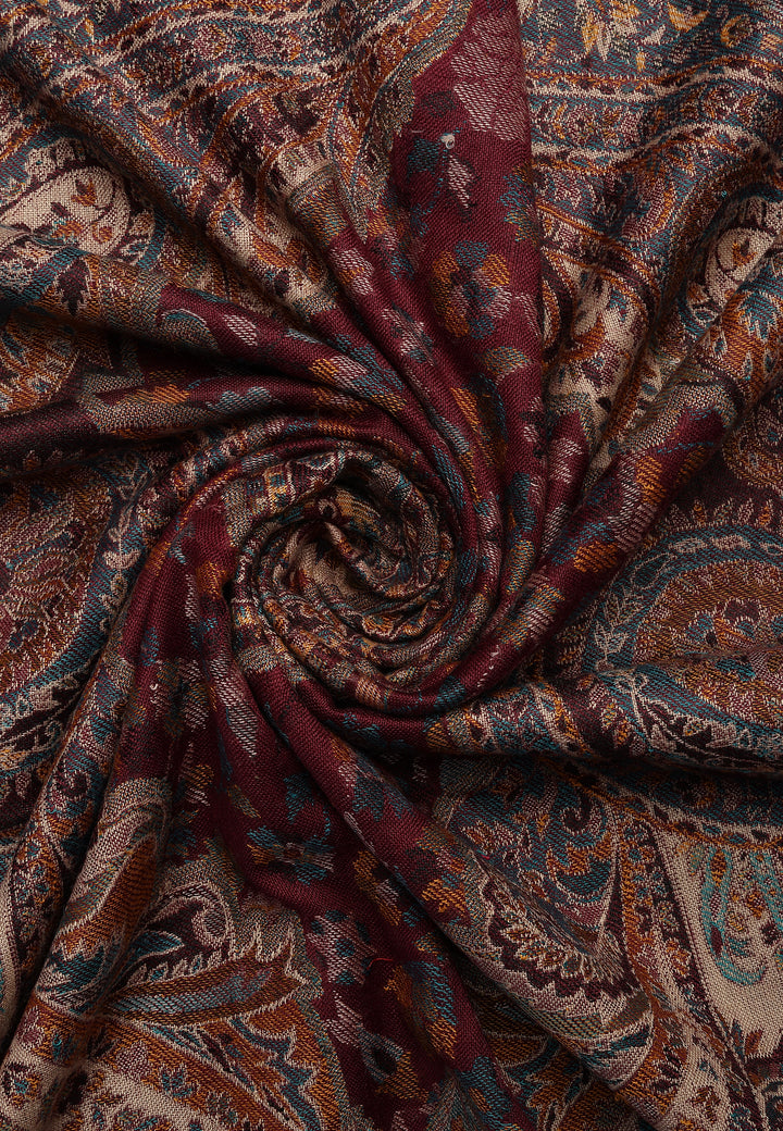 Vackra Jamawar-mönster, på ett mjukt faux pashmina-tyg och traditionell konst. Populära sedan Mughal-eran. Denna traditionella kashmiriska stil sjal har intrikata mönster och kvalitet.