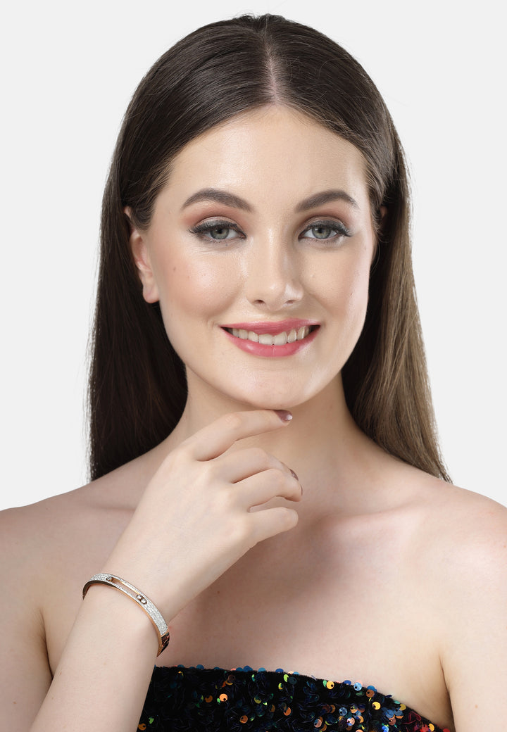 Det klassiske roseguldarmbånd med sølvarbejde, en fantastisk fusion af luksuriøst rosaguld og indviklede sølvdetaljer. Armbåndet har en skinnende roseguldbund, der tilføjer et varmt og feminint touch til designet. Delikate sølvaccenter, omhyggeligt indarbejdet i armbåndets overflade, skaber en fængslende kontrast og tilføjer et strejf af diskret glamour. Perfekt til enhver lejlighed, det vil helt sikkert blive et værdsat tilbehør, der forbedrer dit look med ynde og sofistikering.