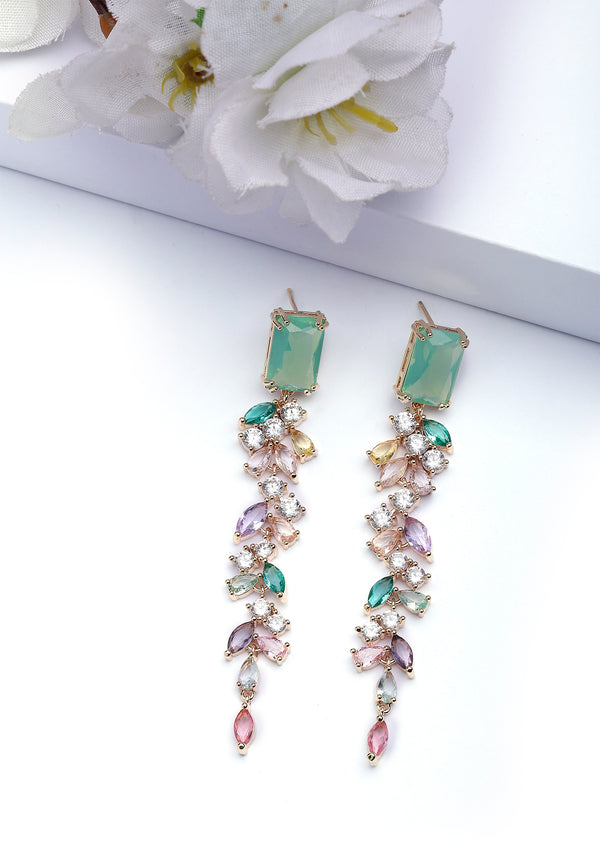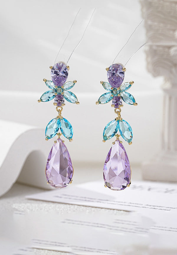 Les boucles d'oreilles pendantes florales en zircone cubique multicolores avec des nuances de bleu et de violet sont un accessoire vibrant et captivant qui ajoute une touche de couleur à...