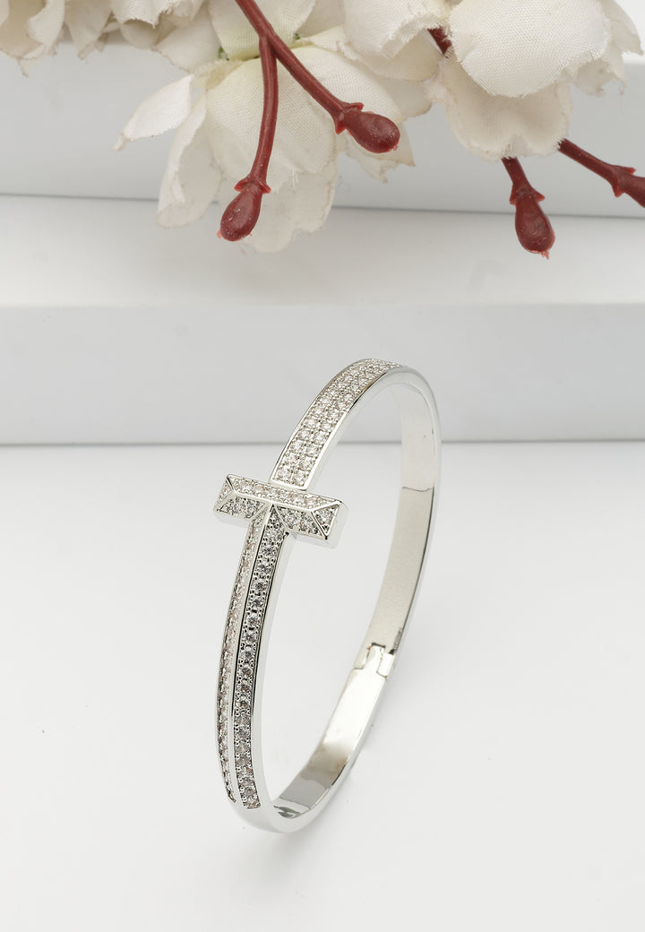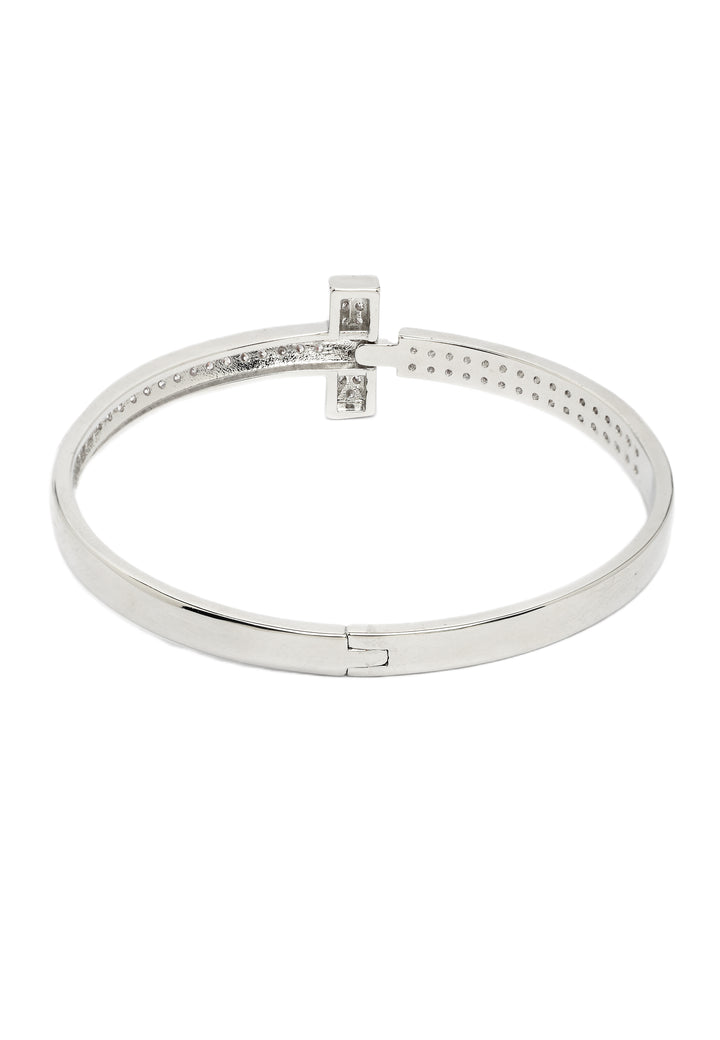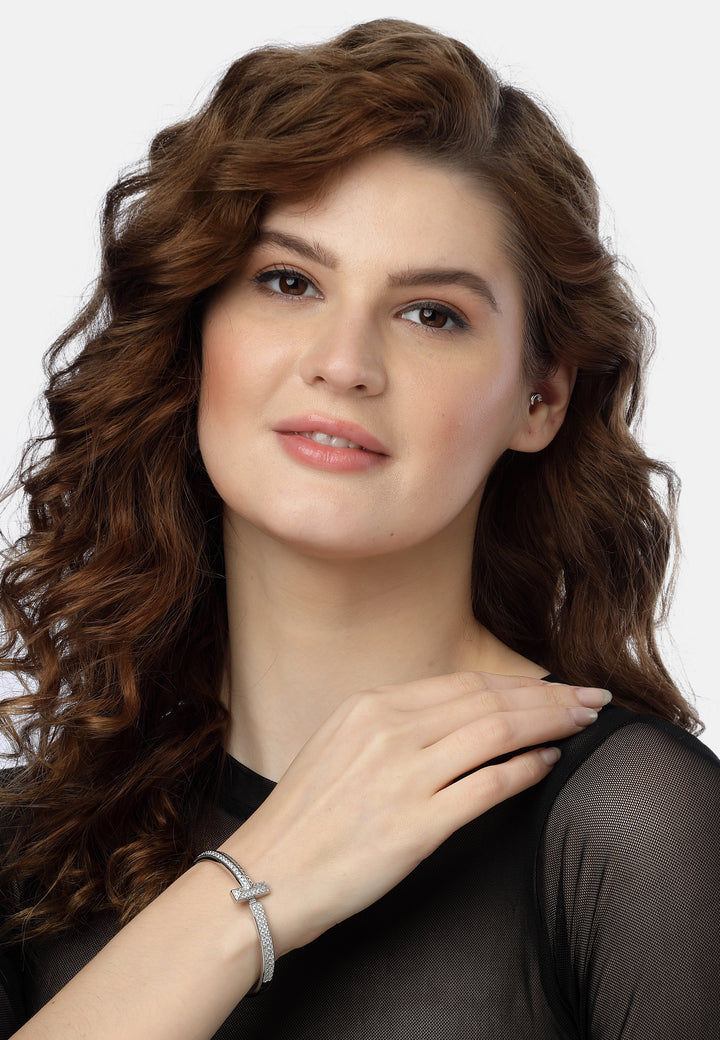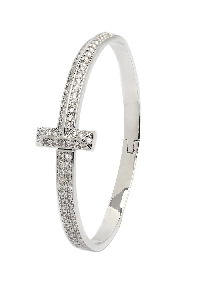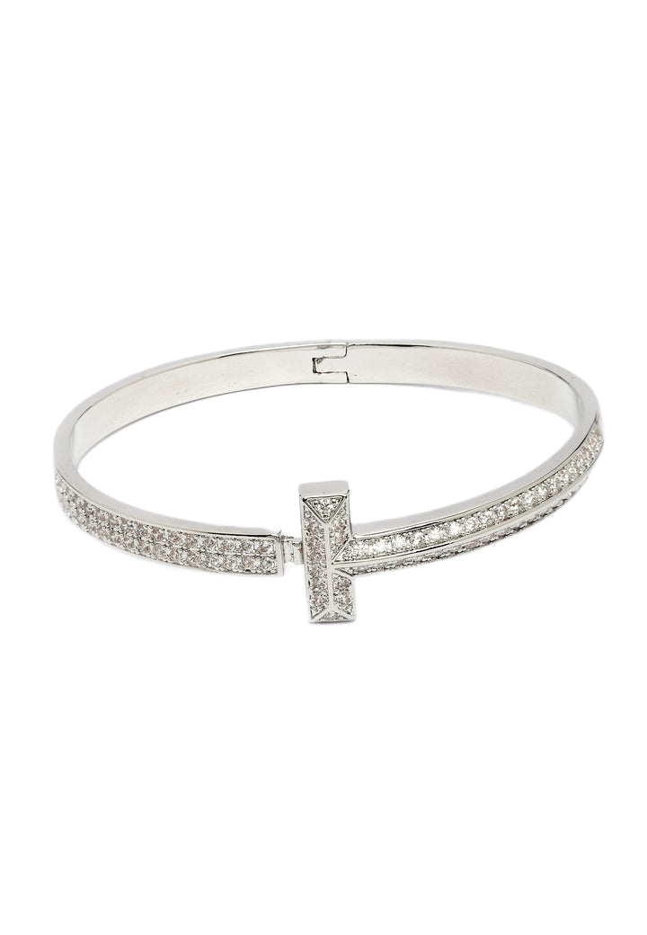 Het minimalistische ontwerp, met een slanke baraccent en een band bezaaid met een verbluffende reeks sprankelende stenen, creëert een opvallende en moderne uitstraling. Het is een betoverend stuk dat elegantie en verfijning uitstraalt, perfect om een vleugje luxe aan elke outfit toe te voegen.