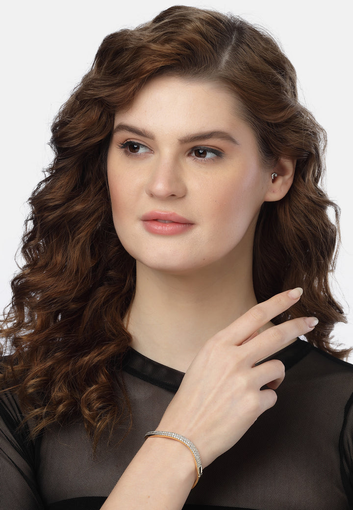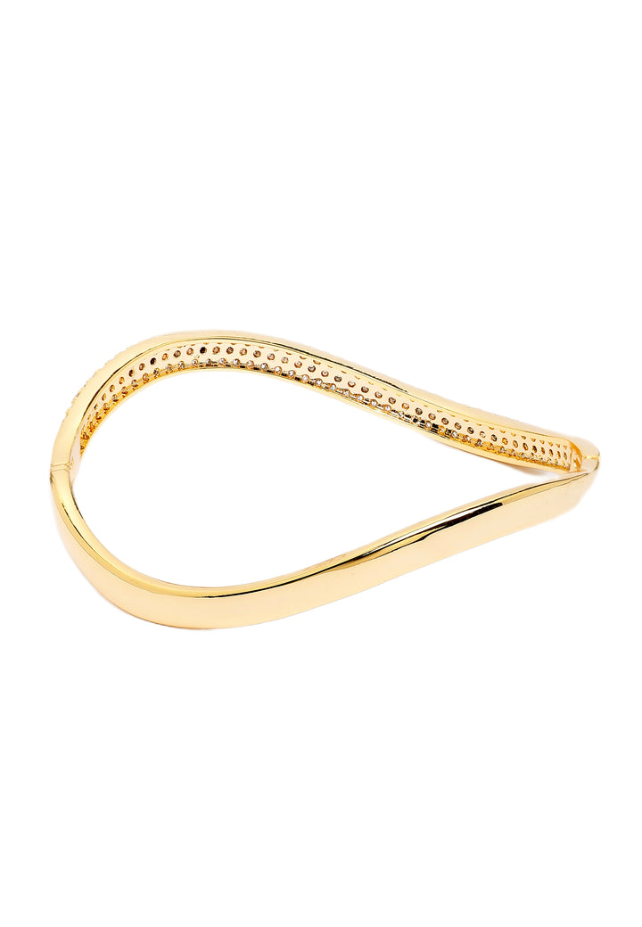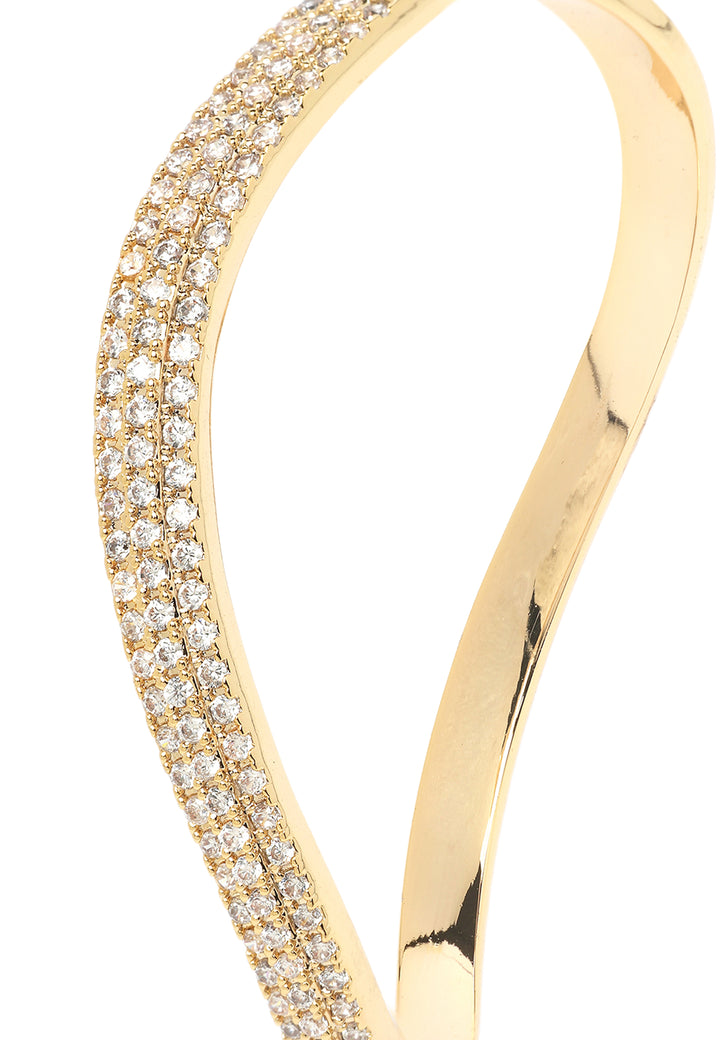 De elegante curve van de band, bezaaid met een verbluffende reeks sprankelende stenen, creëert een betoverende en unieke uitstraling. De warme, gouden tint voegt een vleugje verfijning toe, waardoor het de perfecte accessoire is om elke outfit te verfraaien.