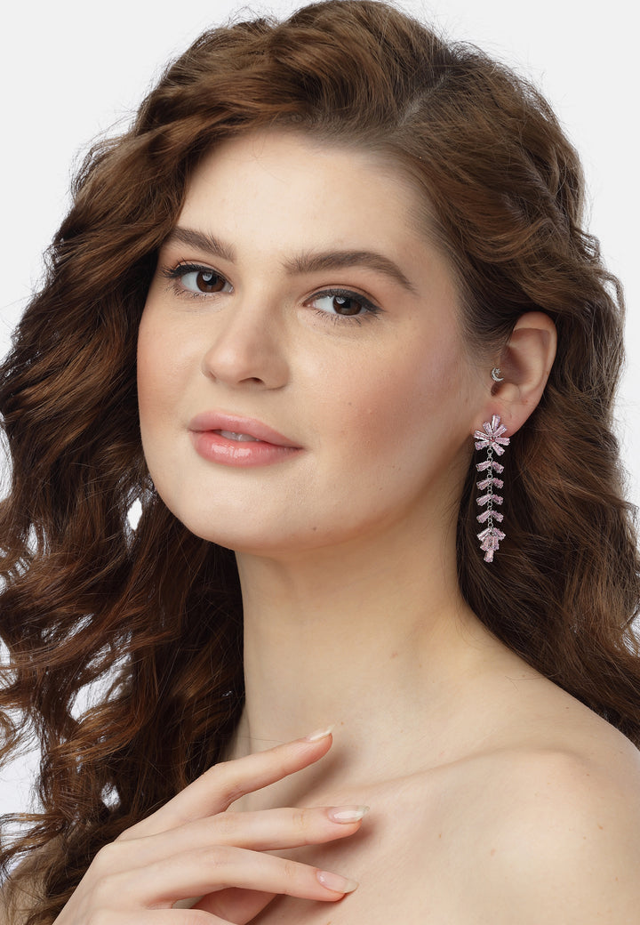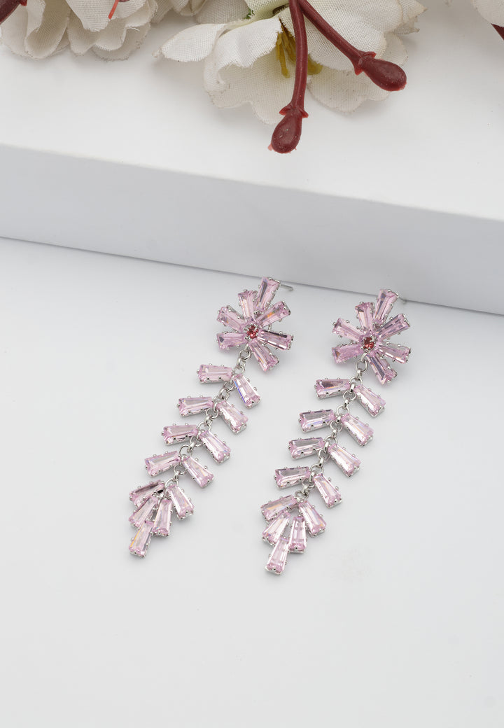 De bloemvormige toppen, versierd met een verbluffende reeks sprankelende roze stenen, maken plaats voor een betoverende waterval van glinsterende kristallen. Het zijn statementstukken die elegantie en charme uitstralen, perfect om een vleugje romantiek en verfijning aan elke outfit toe te voegen.