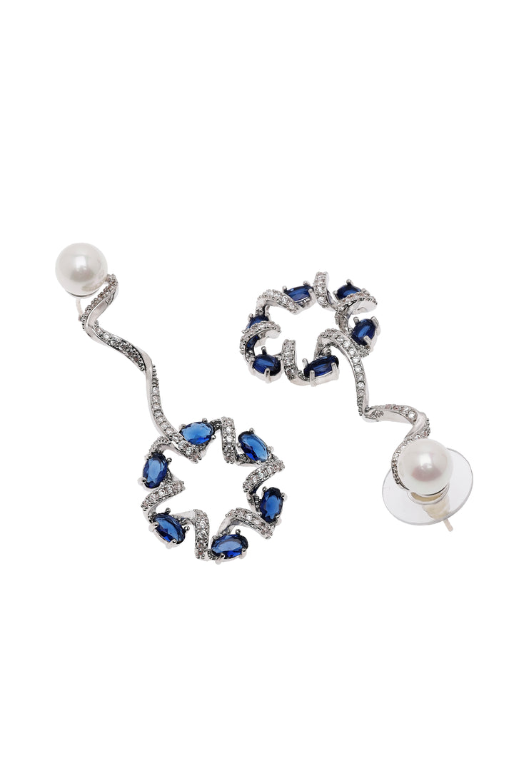 Deze unieke oorhangers combineren klassieke en hedendaagse elementen. Een lumineuze parel zit bovenop een kronkelige, met kristallen versierde steel, die leidt naar een geometrische halo van diepblauwe stenen en sprankelende kristallen. De contrasterende texturen en vormen creëren een opvallend en modern statementstuk.