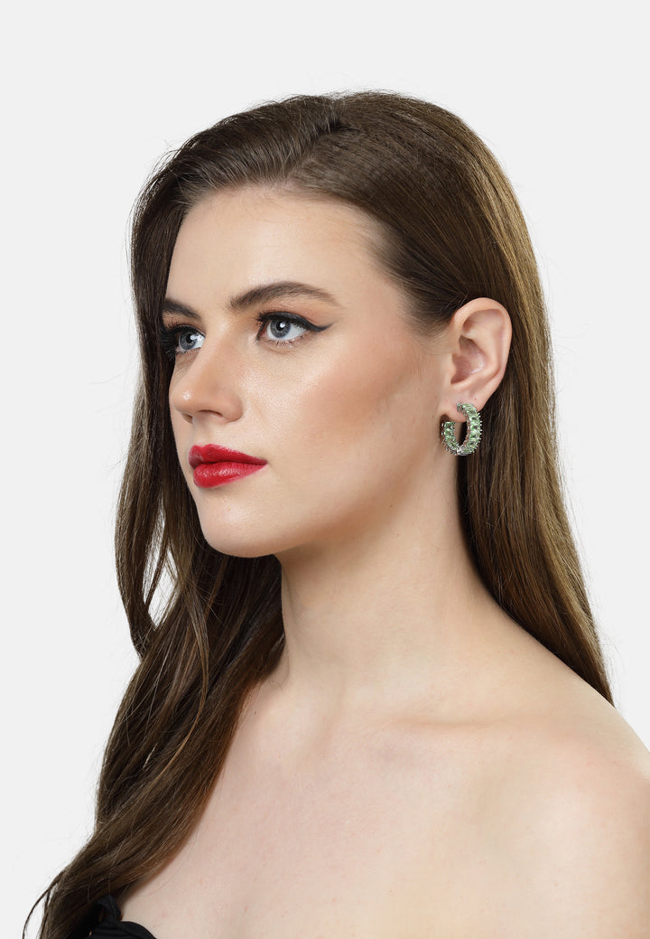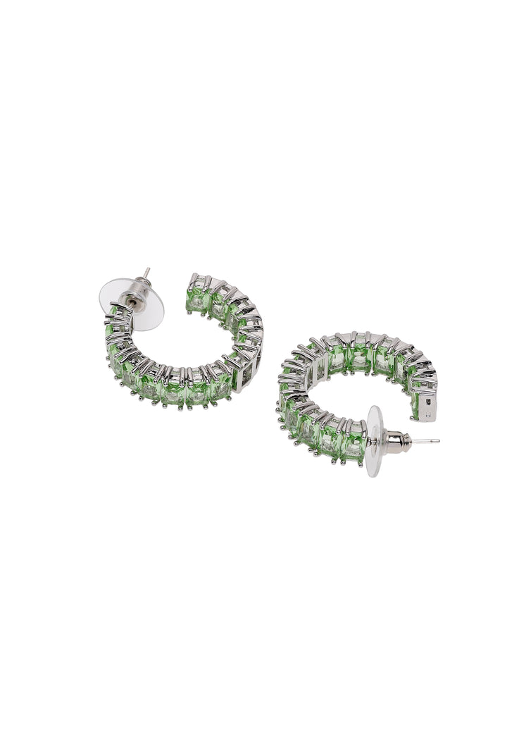 Deze betoverende creolen stralen een verfrissende, muntachtige luminescentie uit. Elke hoop is zorgvuldig vervaardigd met een reeks vierkant geslepen, lichtgroene kristallen, gezet in een slank, zilverkleurig frame. De kristallen vangen het licht met een delicate glans, waardoor een koele en verfijnde sprankeling ontstaat. Hun moderne, geometrische ontwerp en subtiele kleurenpalet maken ze tot een perfect statementstuk, dat een vleugje hedendaagse elegantie toevoegt aan elke outfit.